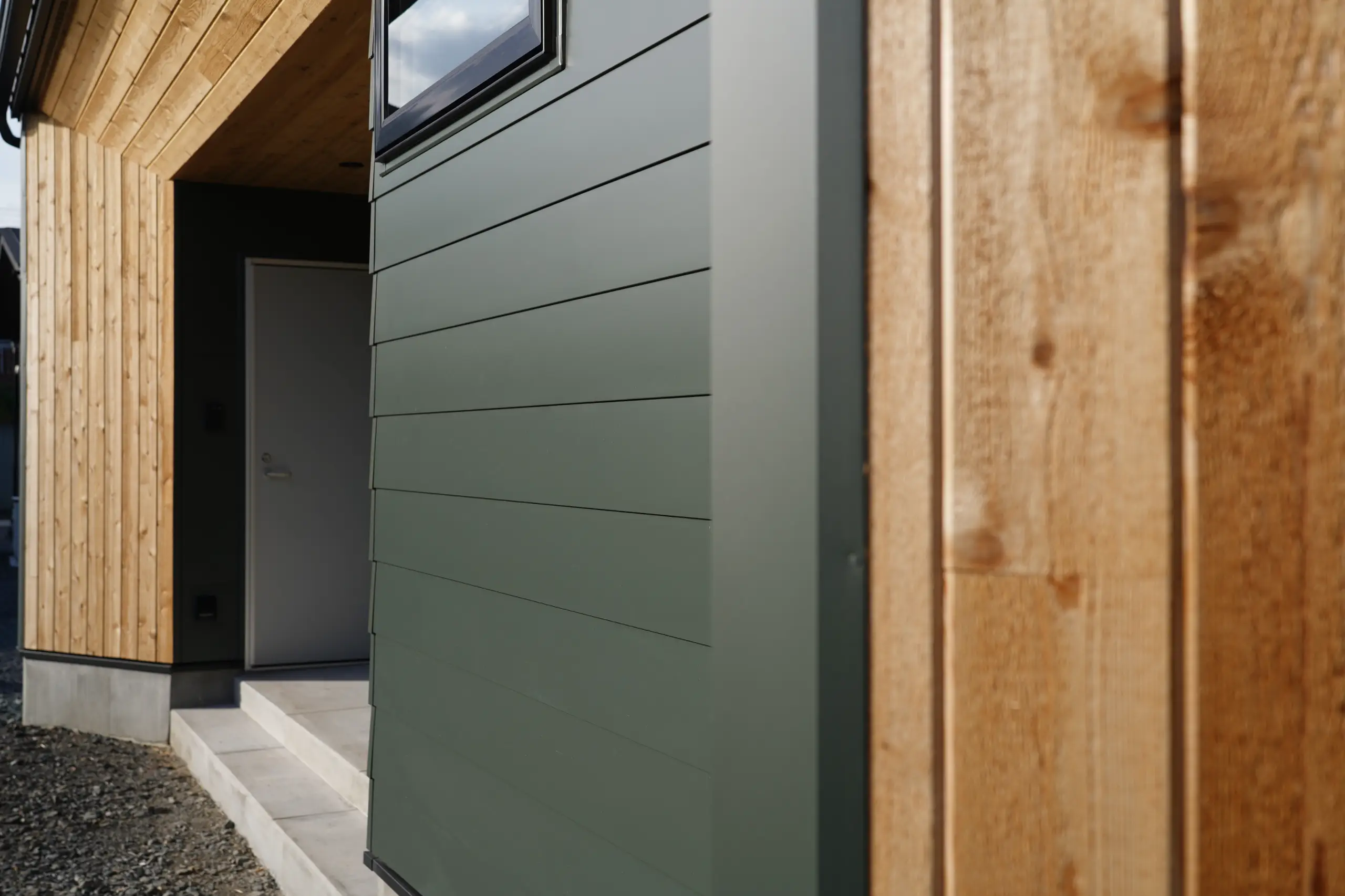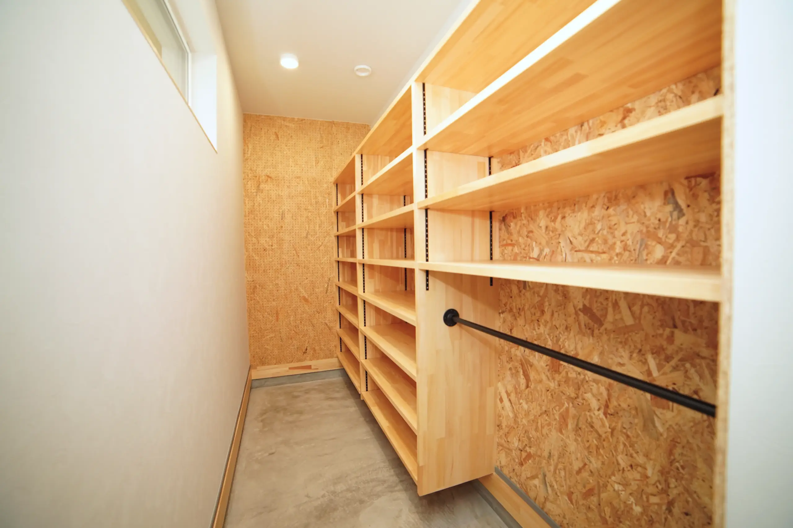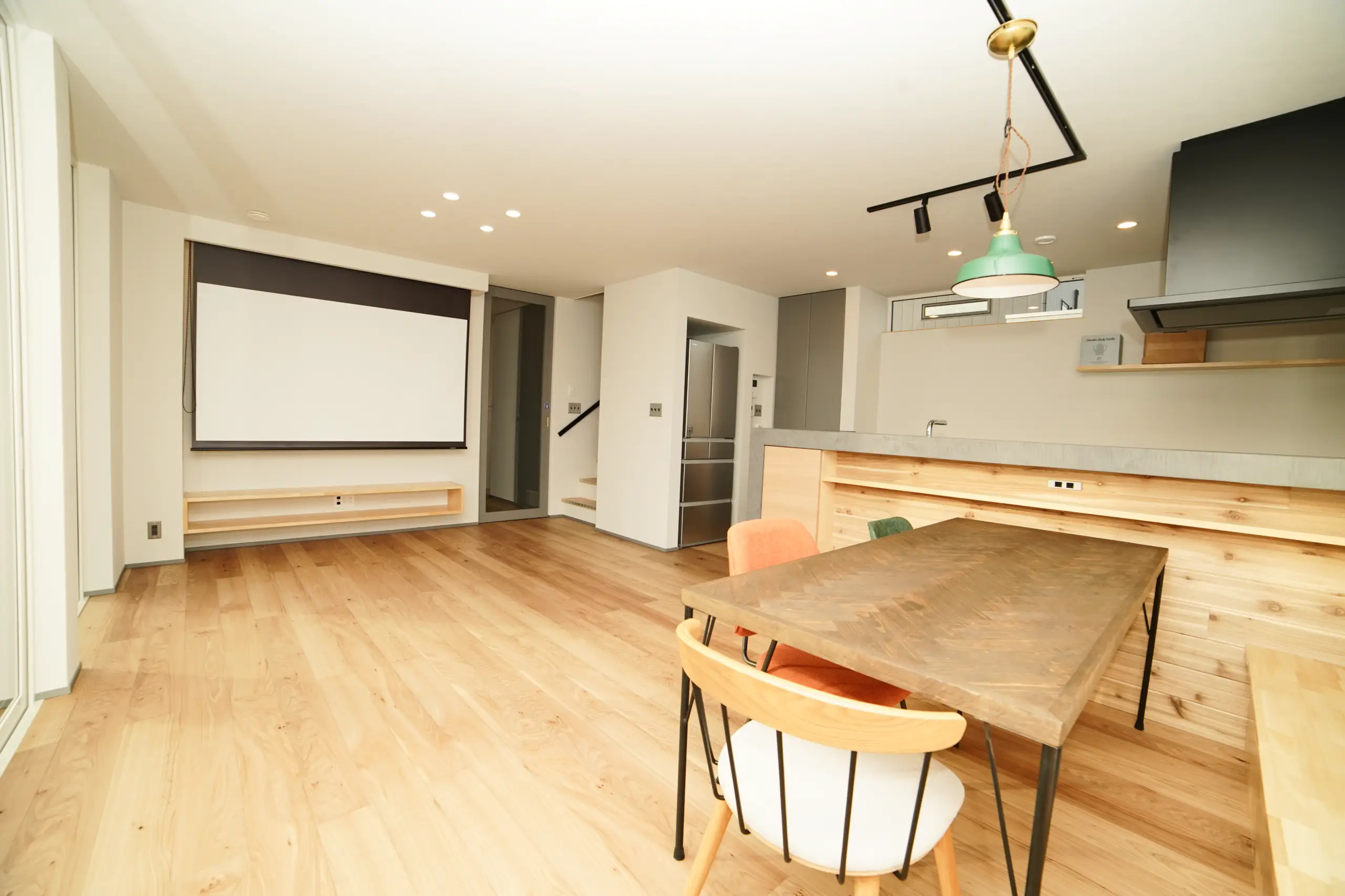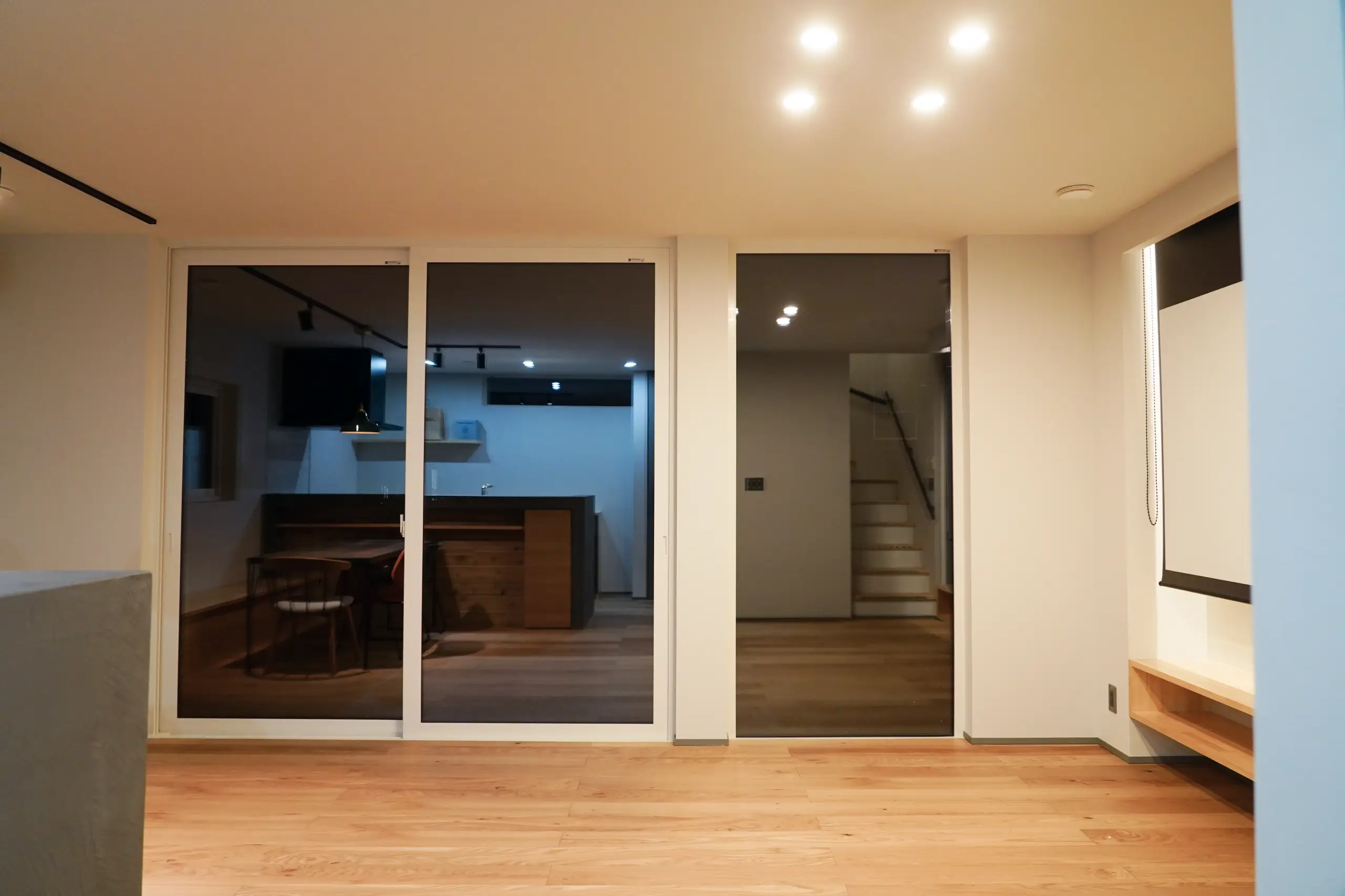 黒と真鍮のマリンデッキライトやアルミ加工のステップなど随所にインダストリアル感が散りばめられた無骨でヴィンテージな空間。グレージュをベースとした内装は枠レスのフルハイドアで細部までスタイリッシュ。夫婦子供2人の4人家族の家は、将来を見据えて1階のみですべてが完結できる間取り。