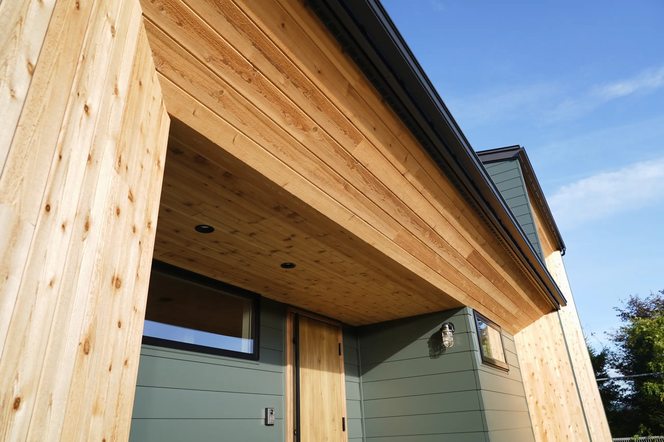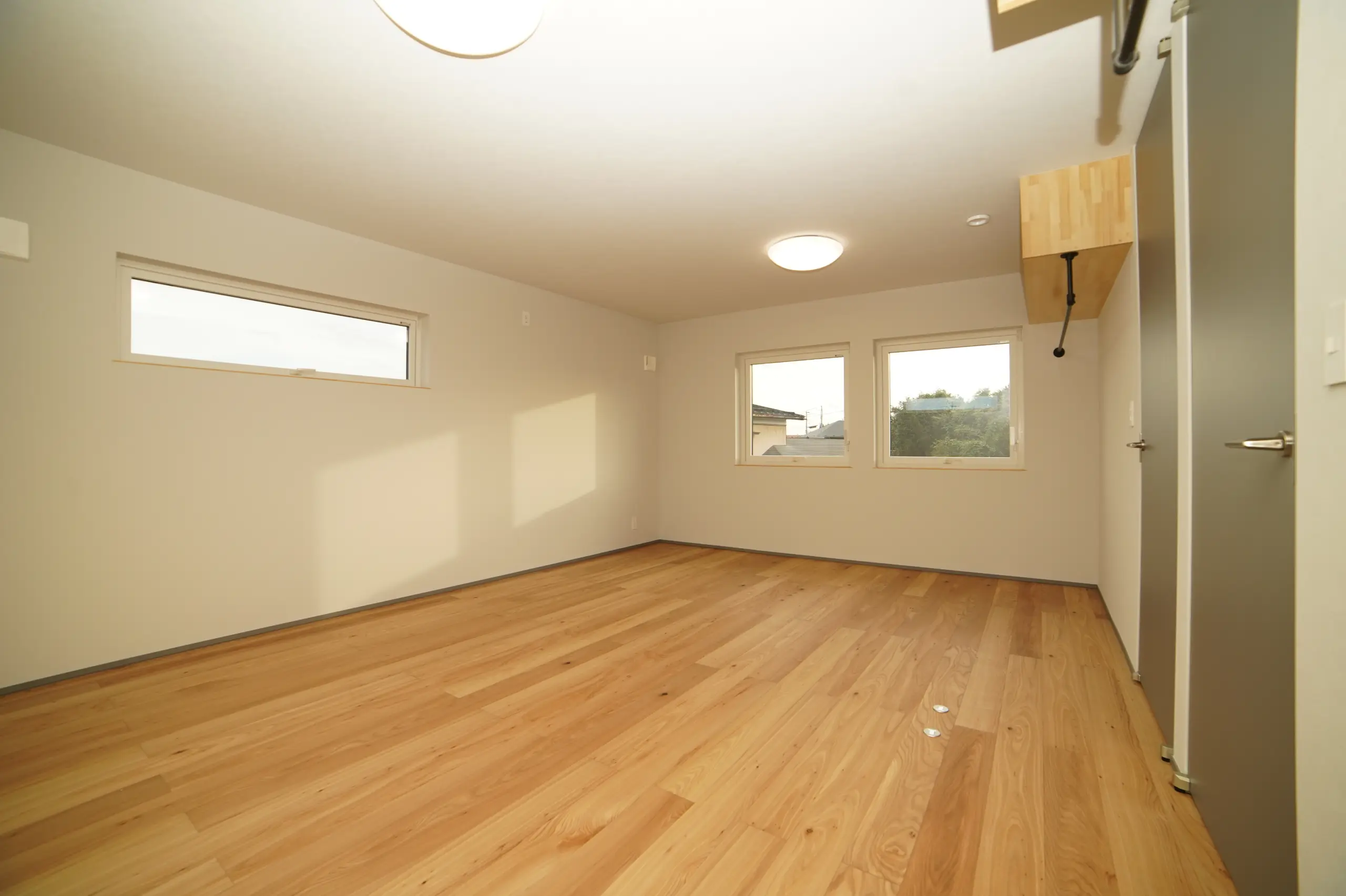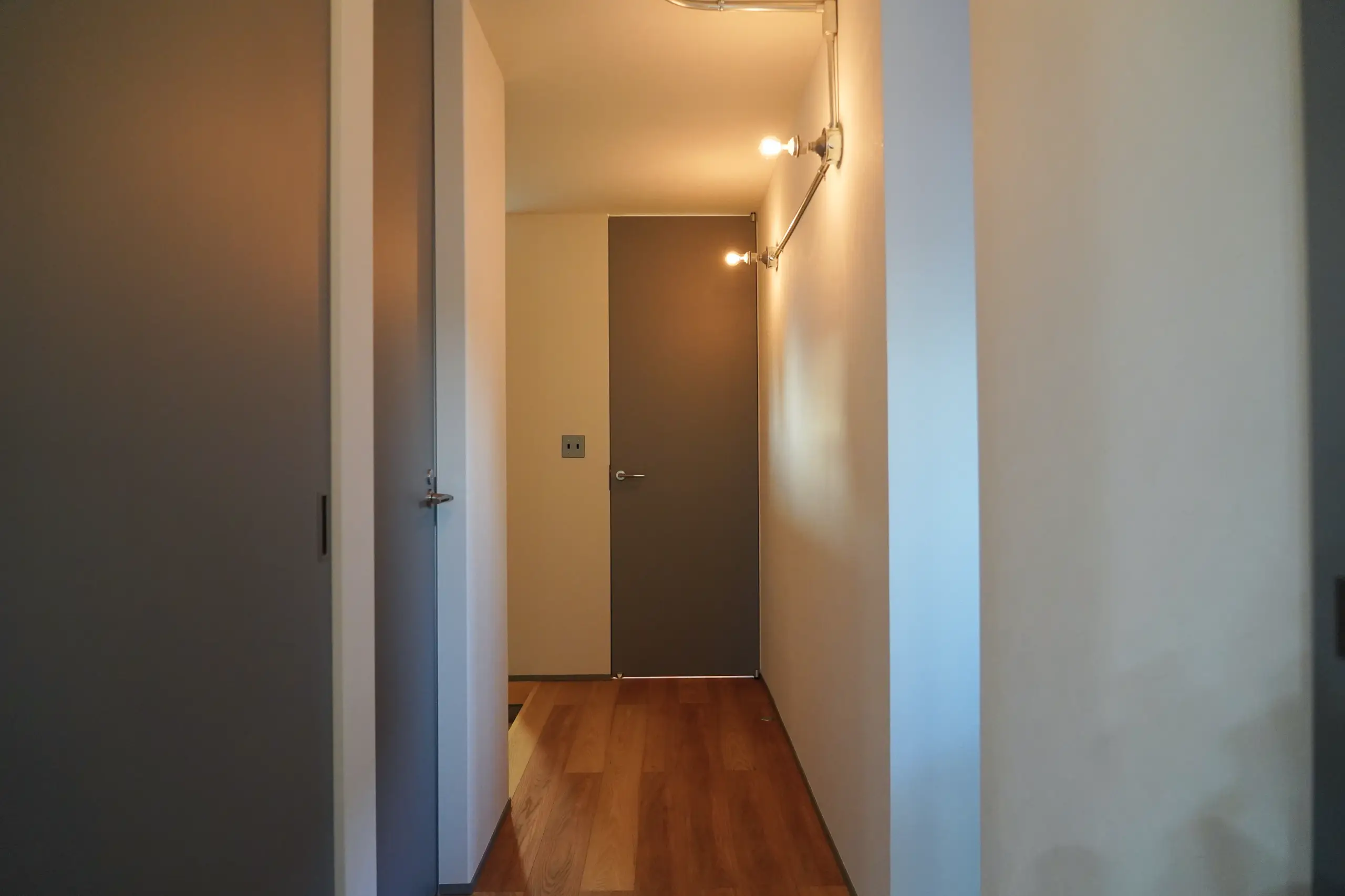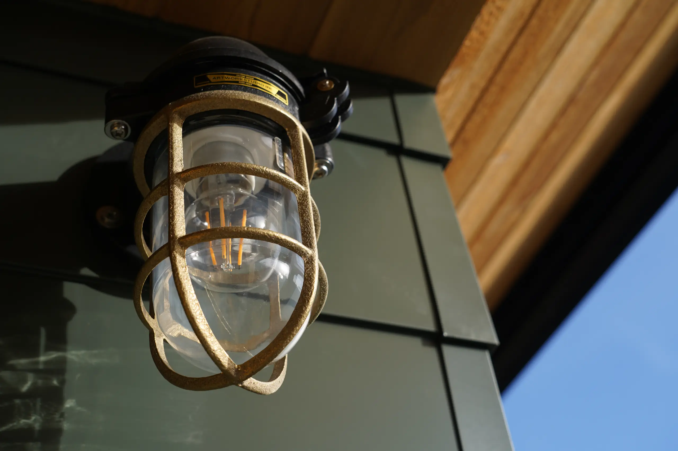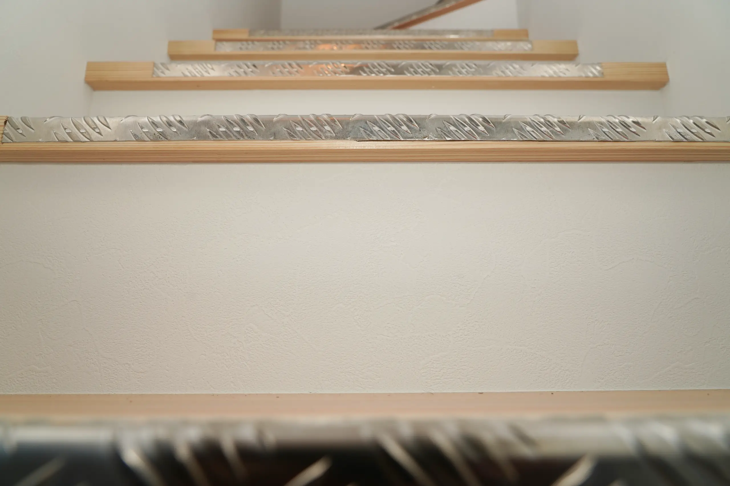 黒と真鍮のマリンデッキライトやアルミ加工のステップなど随所にインダストリアル感が散りばめられた無骨でヴィンテージな空間。グレージュをベースとした内装は枠レスのフルハイドアで細部までスタイリッシュ。夫婦子供2人の4人家族の家は、将来を見据えて1階のみですべてが完結できる間取り。