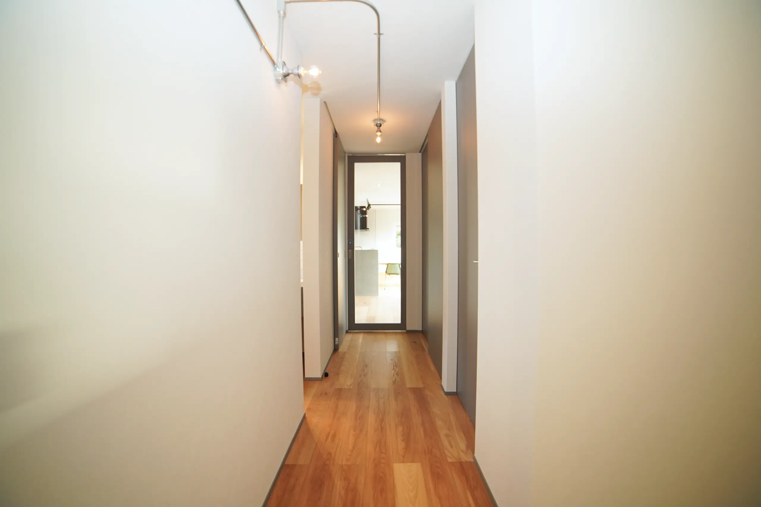 黒と真鍮のマリンデッキライトやアルミ加工のステップなど随所にインダストリアル感が散りばめられた無骨でヴィンテージな空間。グレージュをベースとした内装は枠レスのフルハイドアで細部までスタイリッシュ。夫婦子供2人の4人家族の家は、将来を見据えて1階のみですべてが完結できる間取り。